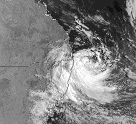 This system began its lifecycle as a subtropical cyclone, with dynamics similar to the Kona Low’s described by Morrison and Businger (2000). In figures 1 and 2, the system is shown just before its highest intensity. Figure 1 is a 2200 GMT visual display from the DMSP F14 Satellite Operational Linescan System (OLS). Figure 2 is from the same DMSP orbit, using the Special Sensor Microwave Imager (SSM/I) 85 GHz (Horizontal Polarization) brightness temperatures. From a subjective view, some have commented that this system seems similar to a conventional tropical cyclone (TC). The storm began as a cutoff low, then underwent anomalous (retrograde) westward movement, making landfall south of Brisbane Australia. As a