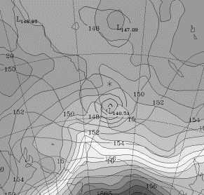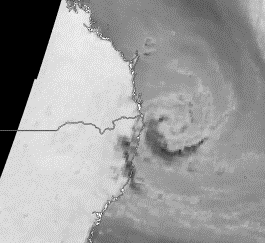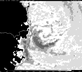 This system began its lifecycle as a subtropical cyclone, with dynamics similar to the Kona Low’s described by Morrison and Businger (2000). In figures 1 and 2, the system is shown just before its highest intensity. Figure 1 is a 2200 GMT visual display from the DMSP F14 Satellite Operational Linescan System (OLS). Figure 2 is from the same DMSP orbit, using the Special Sensor Microwave Imager (SSM/I) 85 GHz (Horizontal Polarization) brightness temperatures. From a subjective view, some have commented that this system seems similar to a conventional tropical cyclone (TC). The storm began as a cutoff low, then underwent anomalous (retrograde) westward movement, making landfall south of Brisbane Australia. As a