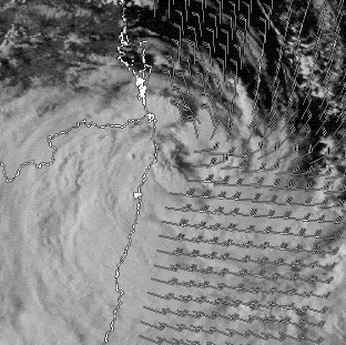 Visual image of the cyclone with QuikSCAT winds (08 March 2001, 06Z)