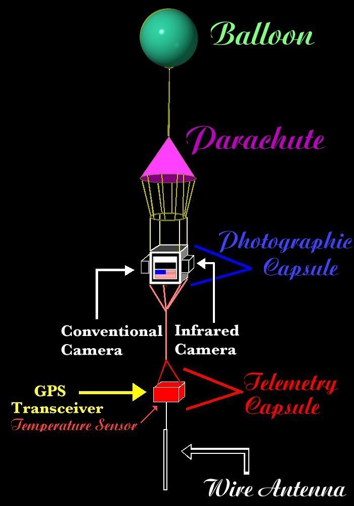 While we hope to achieve some scientific goals, the primary mission is just plain fun, and anybody is welcome to participate - regardless of scientific background, or lack thereof, so really this is a hobby for everyone. The craft consists of four main components: (a) the balloon itself, (b) a parachute (to facilitate a softer landing), (c) the photographic capsule, and (d) the telemetry capsule. Each component is discussed in more detail below..................