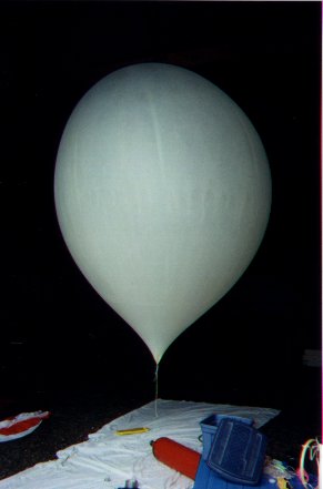 | Here is the balloon, after it was "fully" inflated. We determined the level of inflation by weighing the lifting force of the balloon using a spring weight scale (upside down). We knew we had approximately a 12 pound load, so we kept inflating until the lifting force just exceeded 12 lbs (I think we hit 12.6 lbs of lifting force) | ![]() |