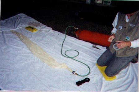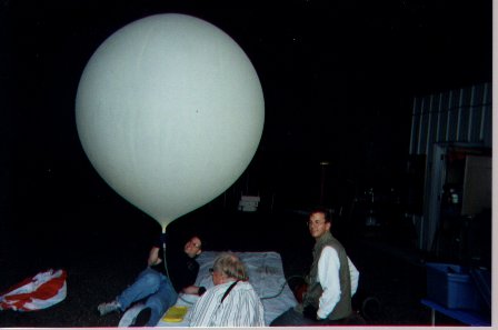 This picture shows Paul Verhage, the resident expert in this effort, getting the ballon ready for inflation. Hope you have enough helium, Paul! |