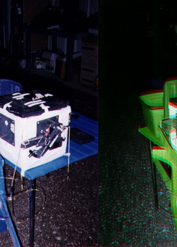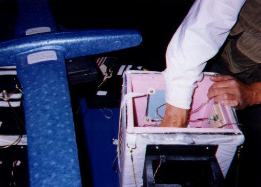 | This picture shows the other photographic module that was intended for the second balloon. The strange black appendage that you see is actually a robot arm with a small TV camera on it! We had hoped to get liveTV pictures from the second balloon. We were pretty excited about this, and had high hopes. I hope to see this work in real-time someday in the future. | ![]() |