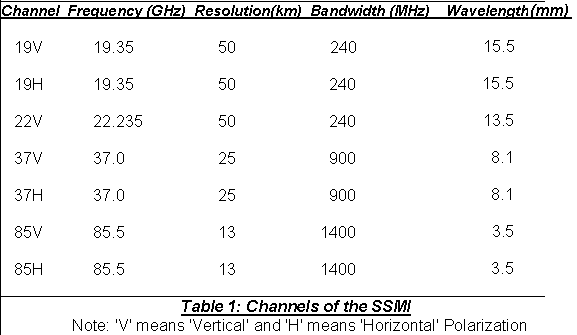 only has a vertically polarized channel. Thus, the SSMI has seven total