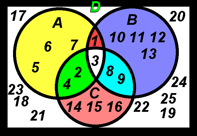 This figure shows the Black Box "D", which contains the numbers - 1 through 25. Since Box "D" contains all the numbers - 1 through 25 - it also includes the numbers in Circle "A", Circle "B" and Circle "C". Notice: